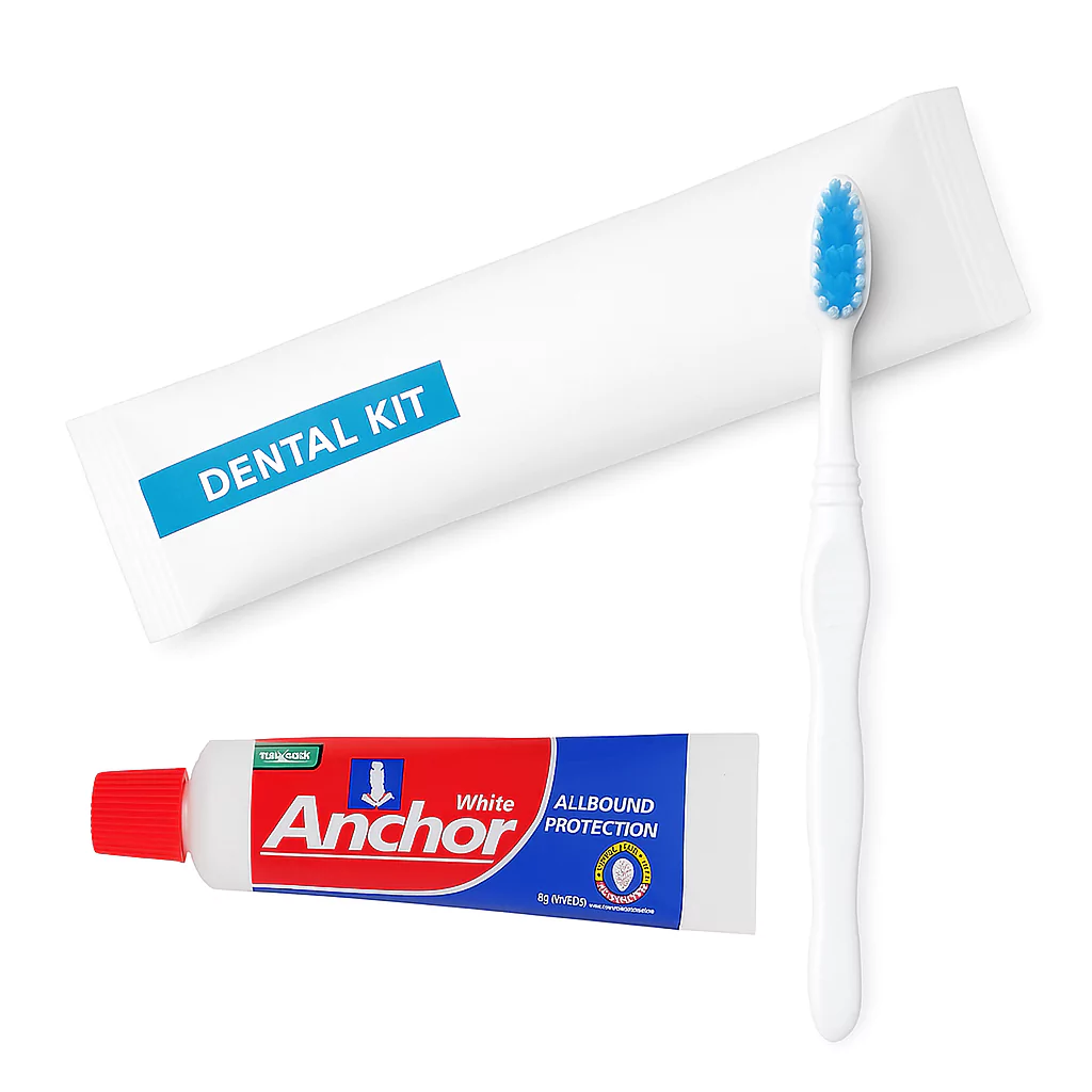 Premium disposable dental kit for hotels and travel use. Includes soft-bristle toothbrush and Anchor White toothpaste ? hygienically packed for guest convenience.