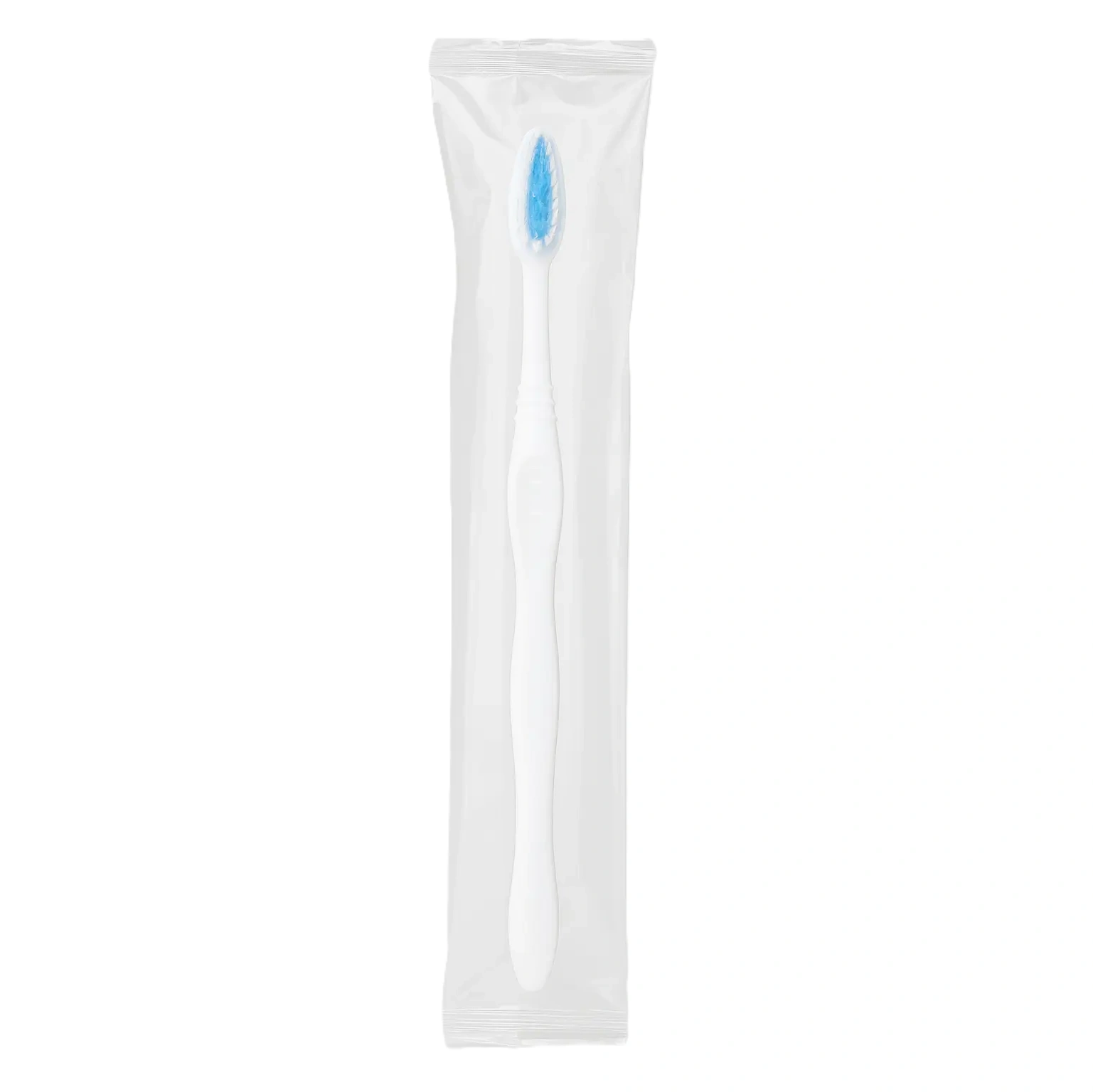 This hotel-use disposable toothbrush is designed for guest comfort and hygiene. It features soft nylon bristles with a blue center and ergonomic white handle. Each toothbrush is sealed in a clean, transparent poly pack to ensure hygiene and convenience for your guests.